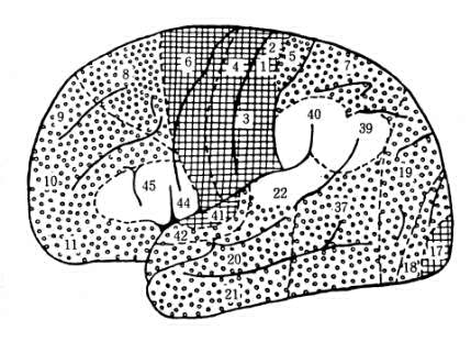 図39−2 連合野の区分。数字はブロードマンによる。網線印、第一次感覚野。 丸印、連合野。空白部、言語野。