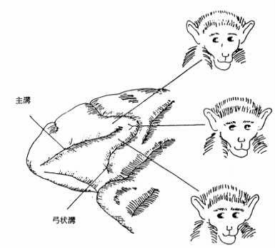 図39−3 サル前頭眼野(8野)の局所電気刺激の効果。反対側への共同偏視 が生じる(Crosby ら 1962 から改描)。