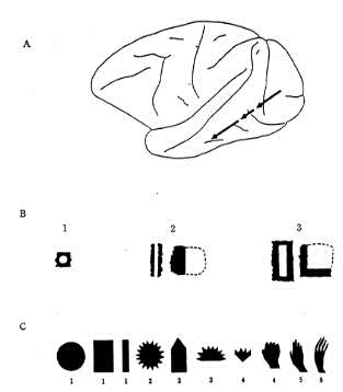 図39−4 A,視覚の皮質路。B、中枢視覚系ニュ−ロンを賦活させるのに有 効な光刺激パターン。1,網膜及び外側膝状体ニューロンに対するもの。2,3, 視覚野及び視覚連合野ニュ−ロンに対するもの。C,下側頭野ニュ−ロンが特異 な刺激パターンで反応を引き起こすことを示した図。各図形の下の数字は反応を 引き起こす程度を示す(Gross ら 1972)。