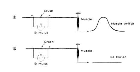 図4−1 A:陽極と陰極間での神経の破壊は、陰極からの活動電位を遮断せず 筋に収縮が起きた。B:刺激電極の陽極と陰極を逆にすると、陰極からの活動電 位の伝導は、神経の破壊により遮断された。
