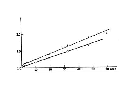 図4−8 指数函数的漸増電流による刺激実験結果(ヒトの尺骨神経) 横軸は漸増電流の時定数RC,縦軸は刺激域値(基電圧の倍数で表わされている)。 〇,● ともに正常人男性での実測値を示す。前者では λ=72msec,後者では λ=67msec。(Solandtによる)