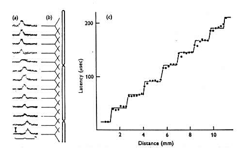 図5−11 そこなわれていない前根からの正常な単一神経線維。(a):0.2mm ごとに前根に沿って記録電極を動かしたときの、単一神経線維から記録された、 細胞外を縦走する電流の連続記録。時間軸は 100 μsec/div。縦軸は 100μV (μA への適当な校正は、神経線維の外部抵抗が分からず出来なかった)。 (b):各々の記録からの実線は、単一神経線維について電極の位置を示してい る。ランヴィエ絞輪の場所は、記録から推測した。(c):細胞外を縦走する電 流のピークの潜時と、神経線維沿いの距離との関係。0 μsec と 0 mm は任意。