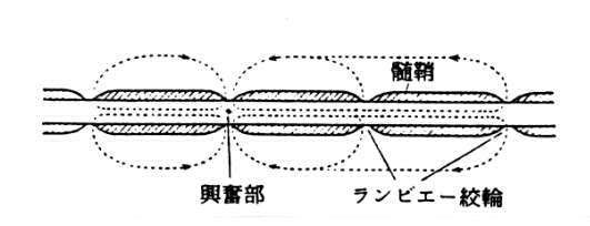図5−7 打点部は興奮部、点線は局所電流の流れ方を示す。