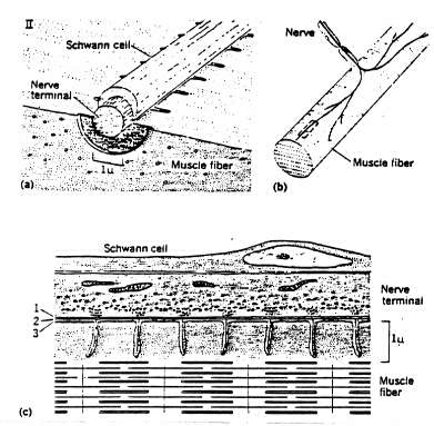 図6−3 カエルの神経筋接合部の構造。スケールは適当。(a)接合部の一部 分。(b)筋線維上の神経終末の位置。小さな長方形で囲まれた部分を拡大した のが(a)図。(c)筋線維に平行な縦断面の電子顕微鏡像の略図。1:神経末 端膜。2:神経と筋線維の間隙にある基底膜。3:筋線維のシナプス後部膜のひ だ。