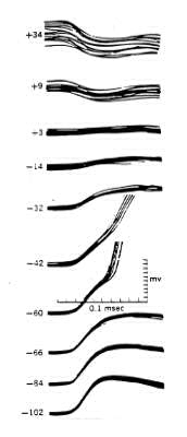 図7−4 求心性の単一シナプス部の斉射により引き起こされた、ネコ脊髄運動 ニュ−ロンの興奮性シナプス後電位の記録。二連式ガラス毛細管電極を用いて細 胞内記録した。二番目の電極を通じて膜に電流を流し、膜の静止電位をそれぞれ の記録の左にある電位(単位mv)に固定した。記録の左に示した電位は、細胞 膜の外に対する内の電位差を表す。上向きの変化が脱分極で、静止膜電位は −66mv。膜の静止電位が−42mvと−60mvの時、興奮性シナプス後電 位は活動電位を引き起こしたが、それ以外の静止電位の時には起こらなかった。 膜電位を0を越えて正とすると、興奮性シナプス後電位は逆転した。(Coombs ら)