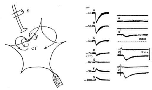 図7−6 左:ネコの脊髄運動ニュ−ロンから、二連式微小電極を用いて細胞内 記録した電位。記録は、陰極線オシロスコープ上の約40本の軌跡を重ね書きし たもので、細胞に抑制を与える神経線維の斉射により得られた抑制性シナプス後 電位を示している。電極の一方を通して定電流を流すことにより、膜電位をトレ ースの左に示してある電位に固定した。AからGは、−80mvを境にして抑制 性シナプス後電位の極性が逆転することを示している。  右:それぞれの組のうちの下側の記録は、細胞に抑制を与えるネコの求心路を 斉射した時の記録。その振幅は、AからDへうつるにつれ増加し、隣接する後根 上に穿入した他の電極により得られた鋭い下向きのふれにより示されている。記 録は抑制性シナプス後電位の段階的変化と、抑制効果の空間的加重を示している。 (From Coombs et al.)