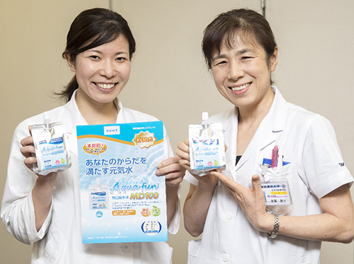 「アクアファンMD100」は、マルトデキストリンとビタミンB1を配合し、効率よくエネルギーも補給できる経口補水液です。手術前の経口補水を目的に臨床栄養部と麻酔科が開発協力しました。術前だけでなく下痢、嘔吐、発熱などによる脱水時や食欲不振時にも適した飲料で、こどもからお年寄りまで幅広い年齢層にご使用頂けます。