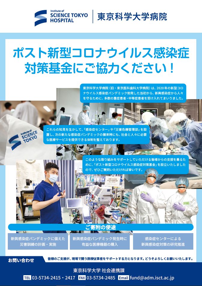 2024 年10 月の東京医科歯科大学、東京工業大学の統合を契機に創設した基金で、多種多様な寄附メニューをご用意しております。その中から、「ポスト新型コロナウイルス感染症対策基金」へのご支援をご検討いただき、ありがとうございます。皆様の温かいご支援とご協力を、心よりお願い申し上げます。