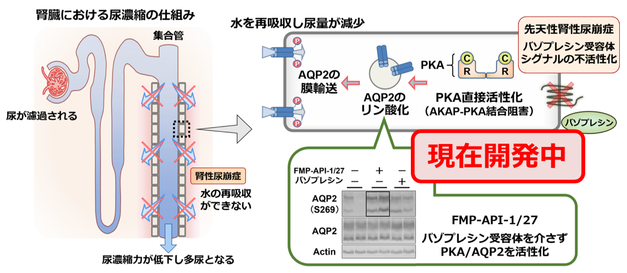 また当教室では最近PKA, AKAPという分子に着目し尿濃縮の新しいメカニズムを明らかにしました。これらの分子をターゲットにした新たな治療は、これまで対症療法が主体となっていた腎性尿崩症に対して、全く異なった効果的な治療法となる可能性を秘めており、臨床応用を目指して研究を進めています。
