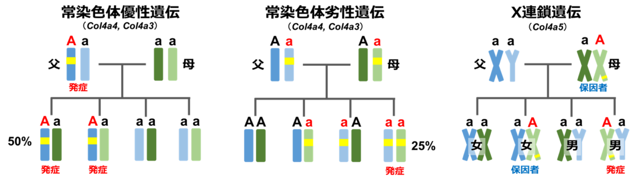 アルポート症候群(Alport症候群)は慢性腎炎(タンパク尿や血尿)、難聴、眼の合併症をおこす病気で、しばしば末期腎不全へと進行します。腎臓の糸球体という部分を構成するのに重要な蛋白である4型コラーゲンのα3鎖、α4鎖またはα5鎖をコードしている遺伝子COL4A3、COL4A4、COL4A5遺伝子のいずれかに異常がある場合に発症します。これらの蛋白は内耳や眼にも存在するため、難聴や眼症状を合併することがあるのはこのためです。国内での頻度は不明ですが、欧米からは5,000-10,000人に1人の割合で発症すると報告されています。遺伝性の疾患であり、ほとんどの場合、ご家族に同様の腎炎の患者さんがいらっしゃいます。しかし、約20%の患者さんでは家族歴がなく、遺伝子の突然変異により発症します。最も頻度が高いのはCOL4A5遺伝子の変異によるX染色体連鎖型アルポート症候群で、男性患者さんでは女性患者さんに比べて明らかに重症の症状を呈することが知られています。また比較的まれではありますが、COL4A3遺伝子やCOL4A4遺伝子の異常でも常染色体優性型や常染色体劣性型の遺伝をします。それぞれの特徴は以下の表の通りです。一方で菲薄基底膜病という診断名があり、これは血尿ないしは軽度のタンパク尿のみの症状が出ますが、腎不全は進行しないものを指します。原因となる遺伝子はCOL4A3/4A4で一部のアルポート症候群と同一ですが、基本的にはヘテロ接合性変異の型をとります。同じ変異でも症状の出方には個人差があり注意が必要です。当科では次世代シークエンサーという遺伝子解析機器を用いた網羅的遺伝子診断を行うことで、確定診断を行なっています。