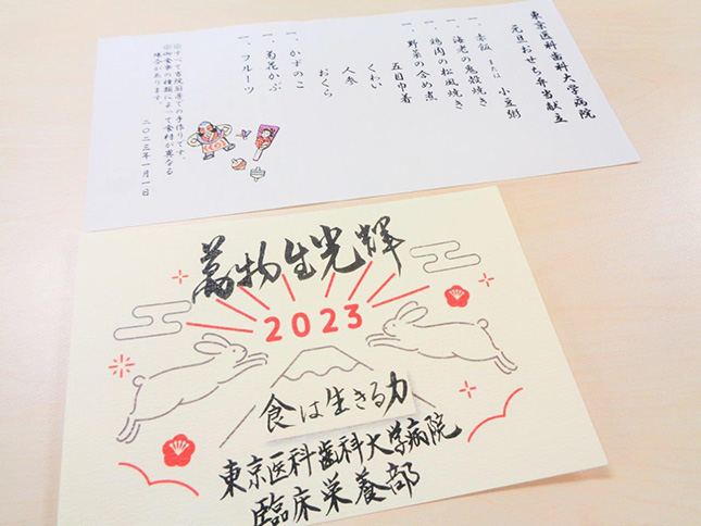 年末年始を病院で過ごす患者さんに、毎年恒例の年越しそばとおせち料理の病院食が提供されました。当院の臨床栄養部スタッフが、腕によりをかけて作ったお料理です。