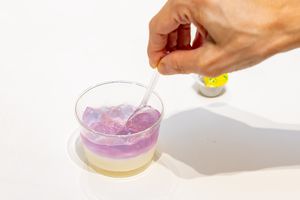 このゼリーは大橋尚美管理栄養士が、東京科学大学のシンボルカラーの青い色を紫キャベツから抽出したアントシアニン色素を用いて再現しました。さらに青色のゼリーにレモン果汁をかけてよく混ぜると、赤紫色に変化する仕掛けになっており、「料理は科学だ!」と思わず納得して心がワクワクする、サイエンスを身近に感じられるゼリーです。下に詳しい説明がありますので、ご覧ください。