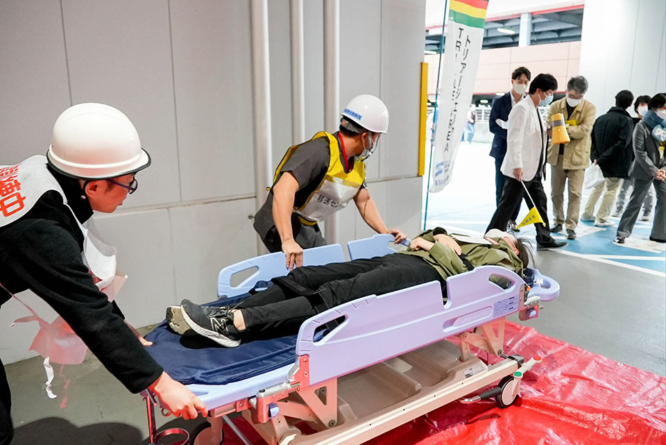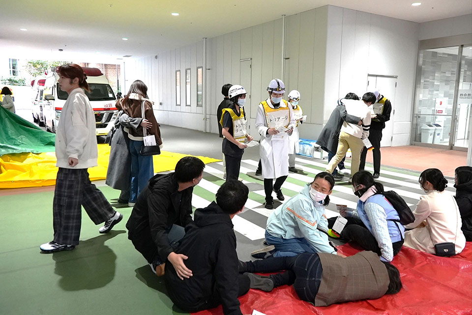 今回の訓練には約350人が参加し、病院スタッフに加えて、学外から近隣の医療機関を中心に9機関32人が視察者として参加しました。また、傷病者役として2機関7人の学生ボランティアも協力しました。約3時間にわたる訓練で浮かび上がった課題や改善点は、今後の災害対策マニュアルの改訂に反映される予定です。