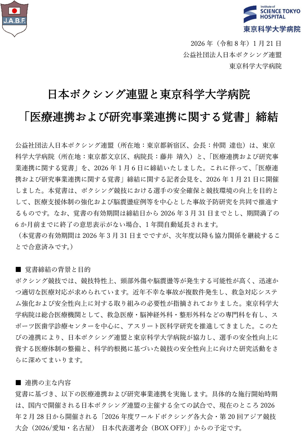 東京科学大学病院は、公益社団法人日本ボクシング連盟(所在地:東京都新宿区、会長:仲間 達也)および、一般財団法人日本ボクシングコミッション(所在地:東京都文京区、理事長:萩原 実)(以下、JBC)と「医療連携および研究事業連携に関する覚書」を2026年1月に、それぞれと締結いたしました。本覚書は、ボクシング競技における選手の安全確保と競技環境の向上を目的として、医療支援体制の強化および脳震盪を中心とした事故予防研究を共同で推進するものです。なお、覚書の有効期間は締結日から2026年3月31日までとし、期間満了の6か月前までに終了の意思表示がない場合、1年間自動延長されます。