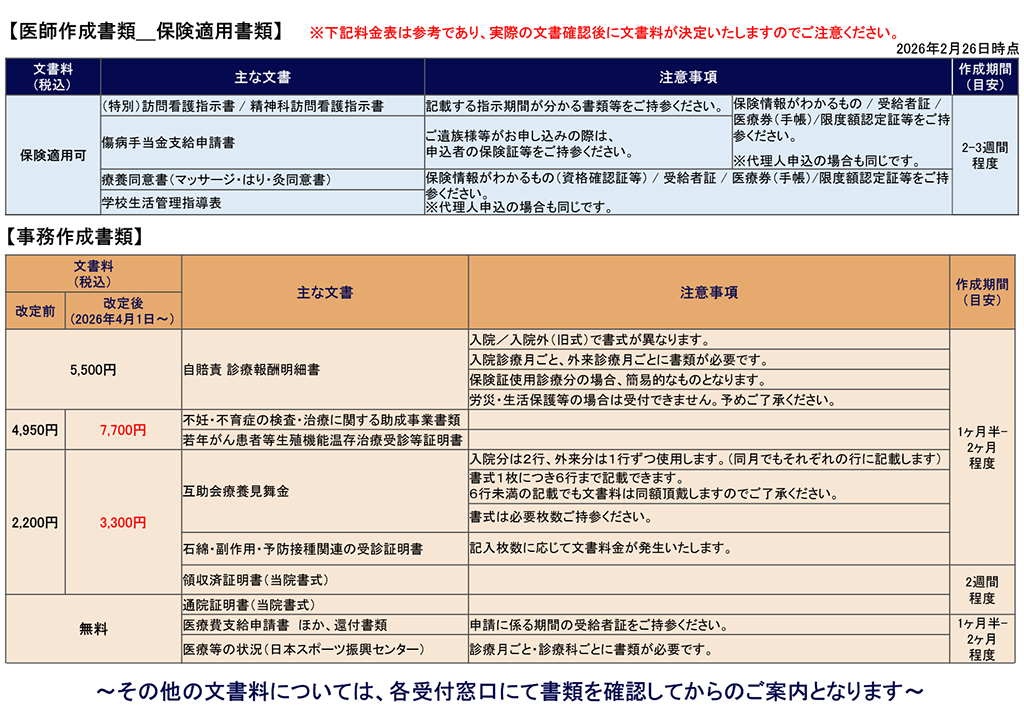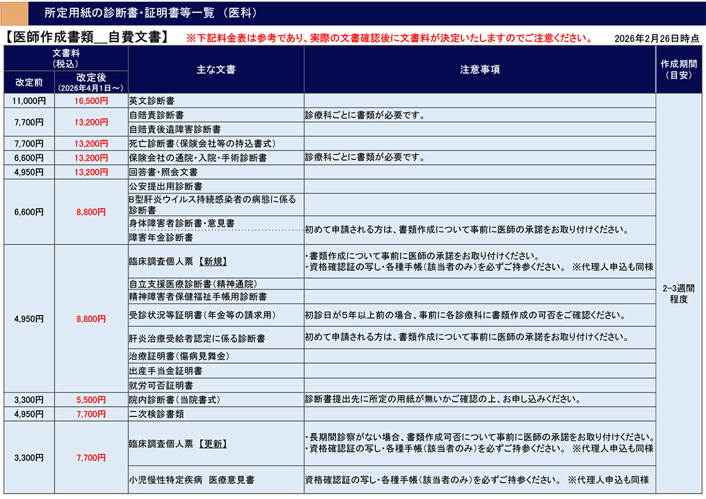 文書料金改定のお知らせ(2026年4月1日受付分~) 2026年4月1日受付分より、全ての文書料金を改定いたします。 改定内容につきましては、下記の料金表をご確認ください。 証明書・診断書のお申し込みに関しては、こちらをご確認ください。 所定用紙の診断書・証明書等一覧(医科)