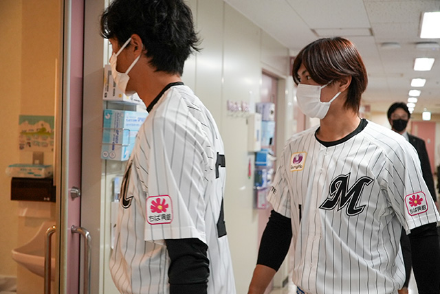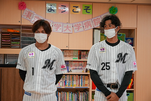 2026年3月19日、千葉ロッテマリーンズの岡大海選手と藤原恭大選手が、東京科学大学病院小児科病棟を訪問してくださいました。今回の訪問は、当院に入院中の男の子が千葉ロッテマリーンズの大ファンであることをきっかけに実現したものです。男の子の主治医が、本学の室伏広治副学長へ相談したことを契機に、室伏副学長がオフシーズンのトレーニングなどで交流のある岡選手に相談し、訪問が実現しました。