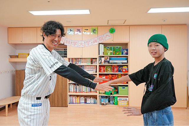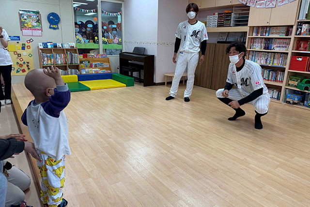 当日は、当該の男の子との面会に加え、小児科病棟に入院している子どもたちやそのご家族とも交流を実施しました。選手からの記念品の贈呈や記念撮影のほか、子どもたちからの質問にお答えしたり、キャッチボールをするなど、終始和やかな雰囲気の中で交流が行われました。両選手には、宮﨑泰成副病院長(次期病院長)より、感謝状が授与されました。訪問してくださった選手の皆様、ありがとうございました!