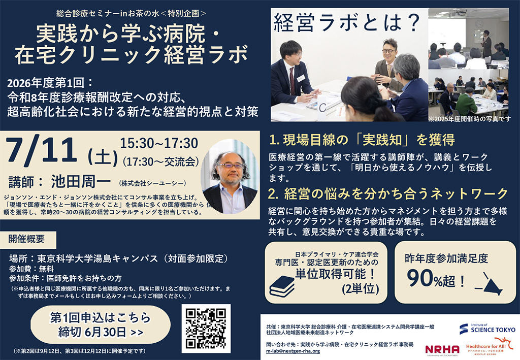 実践から学ぶ病院・在宅クリニック経営ラボは、2026年7月・9月・12月の全三回の開催を予定しております。
