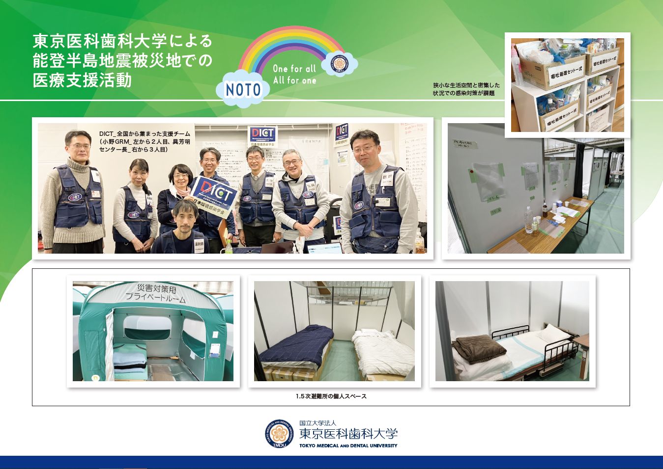 2024年1月22日より東京医科歯科大学病院感染制御部長、およびTMDU感染症センターの具芳明センター長、1月24日より東京医科歯科大学統合診療機構機構長補佐、および東京医科歯科大学病院医療安全管理部の小野和代GRMが、大規模災害の被災地、特に避難施設における感染制御に関する技術的支援手段の検討および災害時感染制御支援チーム(Disaster Infection Control Team:DICT)のメンバーとして、能登半島地震の被災地に向かいました。