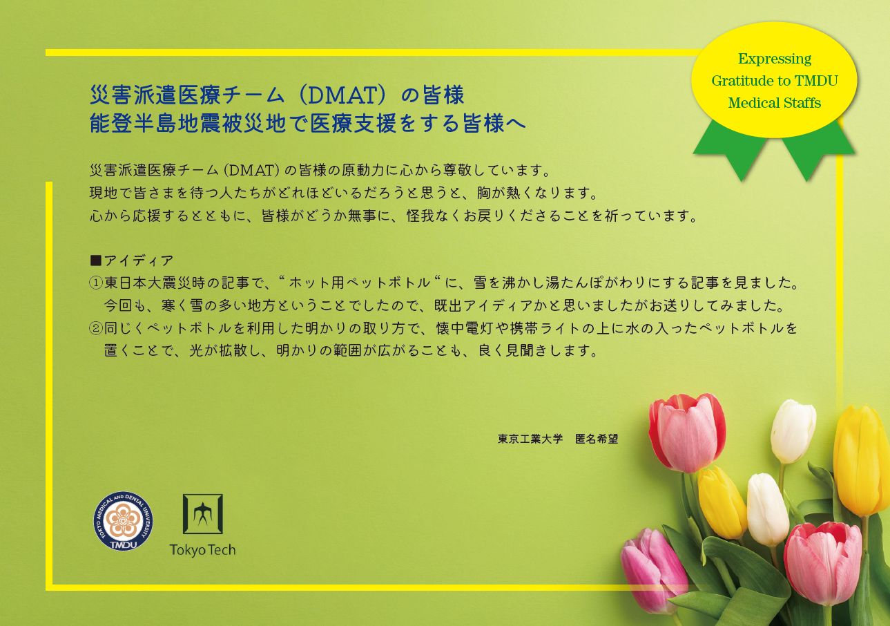 またその活動に賛同した東京医科歯科大学、東京工業大学のスタッフからもたくさんの応援メッセージが届いています。