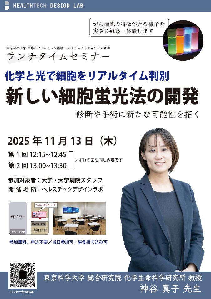 11月13日ランチタイムセミナー開催。テーマは、「化学と光で細胞をリアルタイム判別~新しい細胞蛍光法の開発~診断や手術に新たな可能性を拓く」で、東京科学大学総合研究院化学生命科学研究所の神谷真子教授が発表しました。