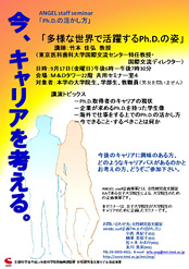 博士を取り巻く環境は厳しいものの、よく見渡せば、Ph.D.を活かす方法は色々ある。まずは現在の研究課題に真摯に取り組み論文に仕上げるなど、目の前の仕事を一つずつ形に仕上げていくことが一番大切であり、その中で視野を広げ、多様な変化をチャンスに変える能力(視点)を身に付けることが大切である、とのメッセージを頂きました。