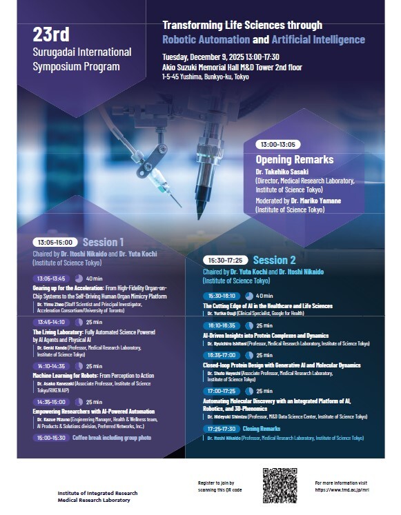 東京科学大学難治疾患研究所では、国際シンポジウムを毎年開催しており、本年で23年目を迎えます。 今回は、研究所の病態制御科学部門が委員会を務め、23rd Surugadai International Symposiumと題しまして、世界的に著名な業績を挙げておられる研究者をお招きして開催致します。多数の方々のご来聴を期待しております。
