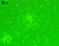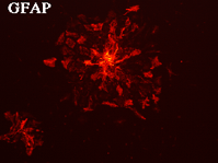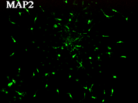神経幹細胞(neurosphere,上段左)をpoly-L-lysineでcoatingした培養皿に移すと(上段右)、MAP2陽性の神経細胞(下段左)とGFAP陽性のグリア細胞(下段右)に分化する。上段右、下段左、下段右は同一視野。 |