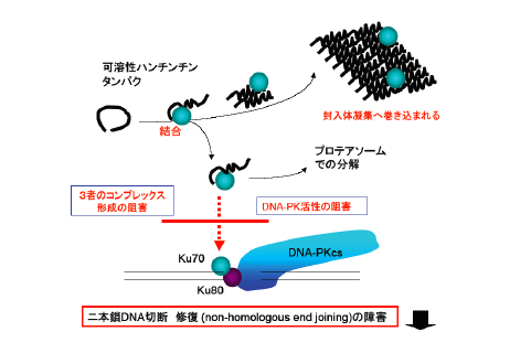 1)変性における核機能異常の網羅的解析 JSTさきがけの支援を受けて、2003-2006年まで、ポリグルタミン病の核機能異常について、トランスクリプトーム/プロテオームの網羅的解析を行ってきました。この実験には、アデノウィルスベクターを用いた初代培養神経細胞でのポリグルタミンタンパク発現系(前助手の田川さんを中心に開発したもの)(Tagawa et al., Journal of Neurochemistry 2004)を主に用いました。3年以上にわたる苦闘の末、神経変性に関わる新しい分子群(HMGB1/2)を同定し、ショウジョウバエモデルでその病的機能を確認しました。簡単にいうと、DNA高次構造やDNAのヒストンからの解きほぐしを制御するHMGBタンパク質がポリグルタミン病態で神経細胞の核の中で低下すると、核機能の広範な障害が起こり、なかでもDNAの損傷修復に異常が起きるというものです。そして、ショウジョウバエを使った神経変性モデルにおいて、HMGBに治療効果が確認されました。これらの成果については、Nature Cell Biologyに2007年に公表しました。詳細は2007年の所感(移動)およびプレスリリースをご覧ください(リンク)。 さらに、インタラクトーム解析(タンパク質相互の結合関係の網羅的情報解析)の結果から、別なDNA修復タンパク質Ku70が、病態関連タンパクの候補として挙がって来ました。私たちは、Ku70の病態機能を、生化学、細胞生物学、マウスモデルを多角的に用いて検討した結果、ハンチントン病の異常タンパク質がKu70と結合して機能を阻害し、その結果、DNA損傷修復が低下していることを証明しました。そして、Ku70のレベルを少し上げてやるだけで、従来の報告を上回る治療効果が得られることも示しました(Enokido, Tamura, Ito et al., Journal of Cell Biology 2010)。プレスリリースを見る(リンク)。