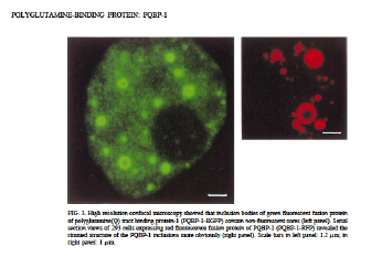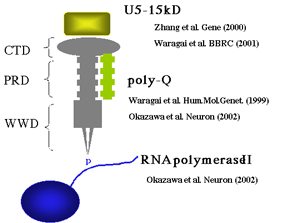2)転写障害によって誘導される新しい神経細胞死 神経変性疾患の中でポリグルタミン病は核内部に異常タンパク蓄積がみられるという特徴を持っています。これまでに、多数のグループが種々の核タンパク(転写関連因子)と異常ポリグルタミンタンパクの結合を示してきました。私たちの報告したPQBP-1もその一つです。さらに、私たちは異常ポリグルタミンタンパクの発現はBrUの取り込みで解析すると総転写量を減少させること確認しました(Hoshino et al., BBRC 2004)。これらの事実はポリグルタミン病で転写障害が生じていること、さらに転写障害が神経変性へ関与することを強く示唆するものです。そこで、わたしたちは、異常タンパクによって核機能が全体としてどのように変化するのか、またどのようなメカニズムで細胞の変調と細胞死が起きるのかに興味を持って研究を進めてきました.この成果の一つとして、2006年2月のJournal of Cell Biologyに、転写障害によって、神経細胞はきわめて緩慢な非典型的細胞死を起こすことを報告しました(プレスリリースにリンクする)。この細胞死はアポトーシスとは異なり、ネクローシスでもありません。現在は、この細胞死が如何なる核由来のシグナルによるものか、このような細胞死は他の神経疾患でも生じうるのか、という疑問を中心に解析を進めています。 3)ポリグルタミン病と精神遅滞に関与する分子PQBP-1 ポリグルタミン病は遺伝子のエクソン内のCAGリピート配列が異常な 長さに伸長するために起きる一連の遺伝性神経変性疾患群の総称です。遺伝性脊髄小脳変性症、ハンチントン病、球脊髄性筋萎縮症など少なくとも9種類の変性疾患がこの範疇に含まれることが分かっています。ポリグルタミン配列は多くの核タンパクに含まれること、いくつかの疾患原因タンパクの機能が核の生理機能に深く関わっていること、疾患タンパクに結合するもののなかに転写関連因子が多いことなどが明らかにされて、核機能障害がポリグルタミン病の発症につながるとの考え方が有力になってきています。 わたしたちはポリグルタミン配列と結合する新しい分子(PQBP-1, PQBP1)を発見し(Waragai et al., Human Molecular Genetics 1999)、PQBP-1が転写とRNA修飾に関連した機能を果たすことを明らかにしてきました。PQBP-1はポリグルタミン病原因タンパクである変異型のAtaxin-1やhuntingtinと結合した結果、PQBP-1が関与する転写障害やスプライシングの異常を起こすことが想定されます(Okazawa et al., Neuron 2002)。PQBP-1はスプライシングが行われる核のnuclear bodyに存在すること(Okazawa et al., Neuron 2002)や、スプライシング因子U5-15kDと結合すること(Waragai et al., BBRC 2002)もその予想を支持しています。