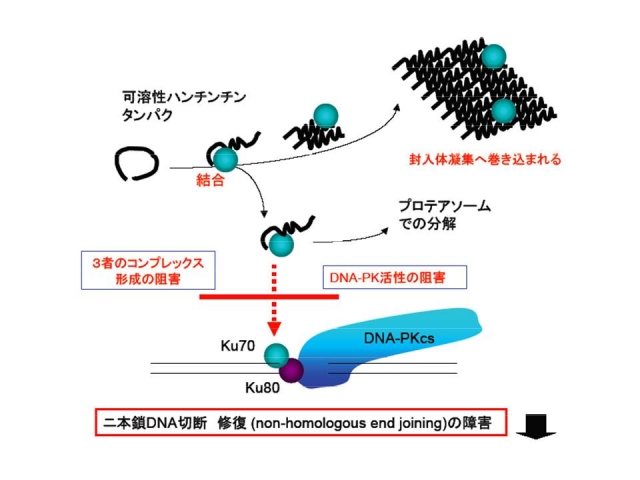- ハンチントン病の原因タンパク質である変異型ハンチンチンは、Ku70との結合を介してDNA損傷修酵素複合体によるDNA2重鎖切断の修復を阻害します