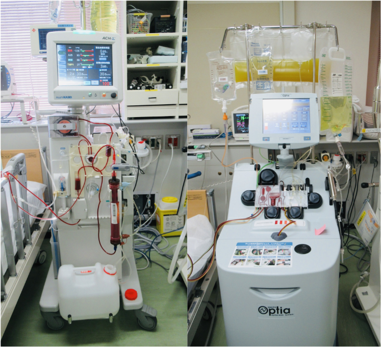 アフェレシス療の中でも最も基本となる治療が血漿交換療法(PE)です。PEは、透析療法と同様に体外循環によって血液を体外へ導出し、膜型血漿分離器または遠心分離器を用いて血球と血漿成分に分離し、血漿成分中に含まれる病因物質(自己抗体、サイトカイン、中毒物質など)を除去し、破棄された血漿と同等濃度のアルブミン溶液または新鮮凍結血漿で置換する治療法です。また、分離した血漿を吸着器へ通すことで病因物質を選択的に除去する血漿吸着療法(DSAL、IAPPなど)や、血液を吸着器へ直接潅流させる顆粒球除去療法(GMA)やレオカーナ、癌などによって、たまった腹水(または胸水)を濾過濃縮して有用なタンパク成分を回収する腹水濾過濃縮再静注法(CART)など、多様なモダリティがあります。国立大学病院の中では、自己免疫性疾患に対するアフェレシス療法(mTPE、cTPE、SePE)や下肢動脈疾患(LEAD)に対するレオカーナの施行件数が多いことが特徴です。