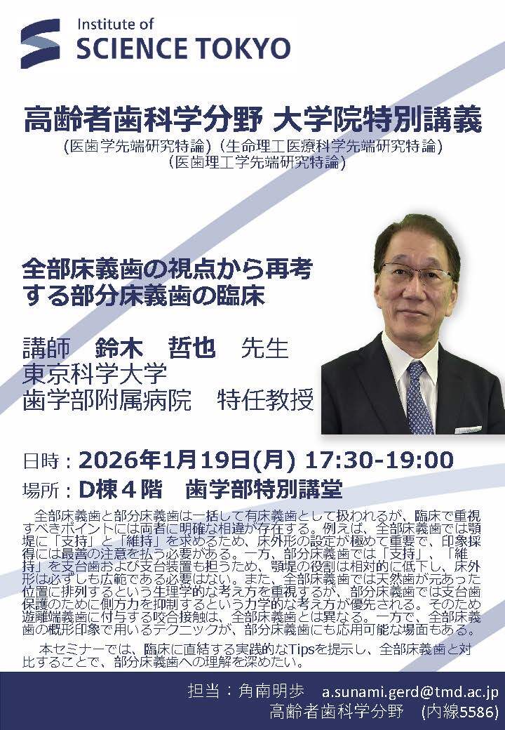「全部床義歯の視点から再考する部分床義歯の臨床」をテーマにご講演いただきます。 他分野の方のご来聴もお待ちしております。 日時:2026年1月19日(月) 17時30分~ 場所:歯学部特別講堂(D棟4階)