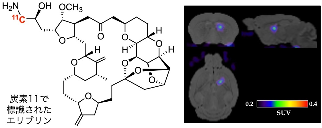 今回共同研究グループは、極めて複雑な化学構造を持つ医薬品であるエリブリンの11Cでの標識法を確立しました。これをPETプローブとして用いるPETイメージング実験により、エリブリンが脳のがん組織に特異的に集積することを明らかにしました。