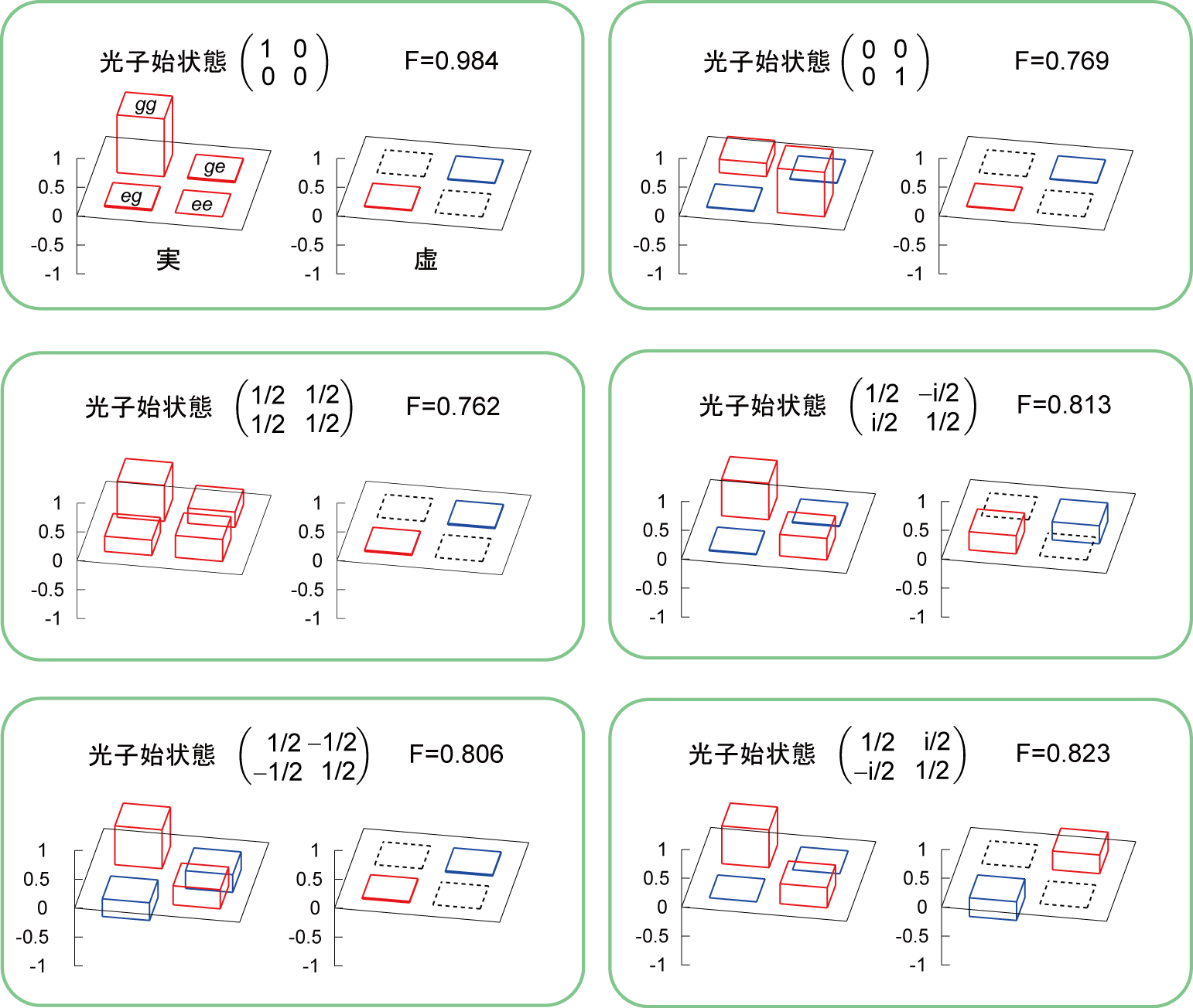 マイクロ波光子から超伝導人工原子への転送実験では、任意の始状態(β1|ωL>+β2|ωH>)にあるマイクロ波光子を基底状態|g>にある超伝導人工原子に入射し、反射後の超伝導人工原子の量子状態を測定します。本来の交換ゲートではマイクロ波として単一光子を入射しますが、本研究では微弱コヒーレント光※2パルス(平均光子数0.1程度)を入射し、反射後の超伝導人工原子状態の平均光子数依存性から単一光子入射に対する結果を推定しました。図2は6種類の入射マイクロ波状態に対する反射後の超伝導人工原子の密度行列※3を示しています。マイクロ波光子の始状態と超伝導人工原子の終状態がよく一致しており、確かに量子ビットが転送されていることを確認できます。6種類の入力状態に対する忠実度※4の平均値は0.826です。