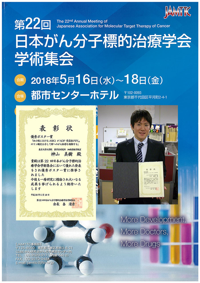 神山美樹,古川夏輝:第22回日本がん分子標的治療学会「優秀ポスター賞,優秀演題賞」受賞