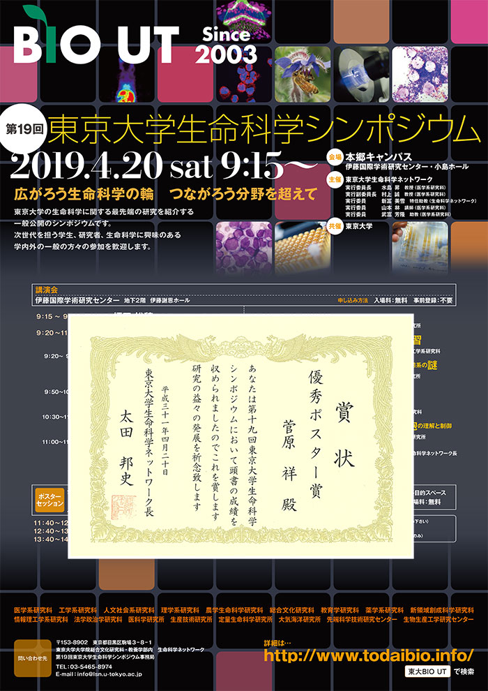 菅原祥:東京大学 生命科学シンポジウム「優秀ポスター賞」受賞