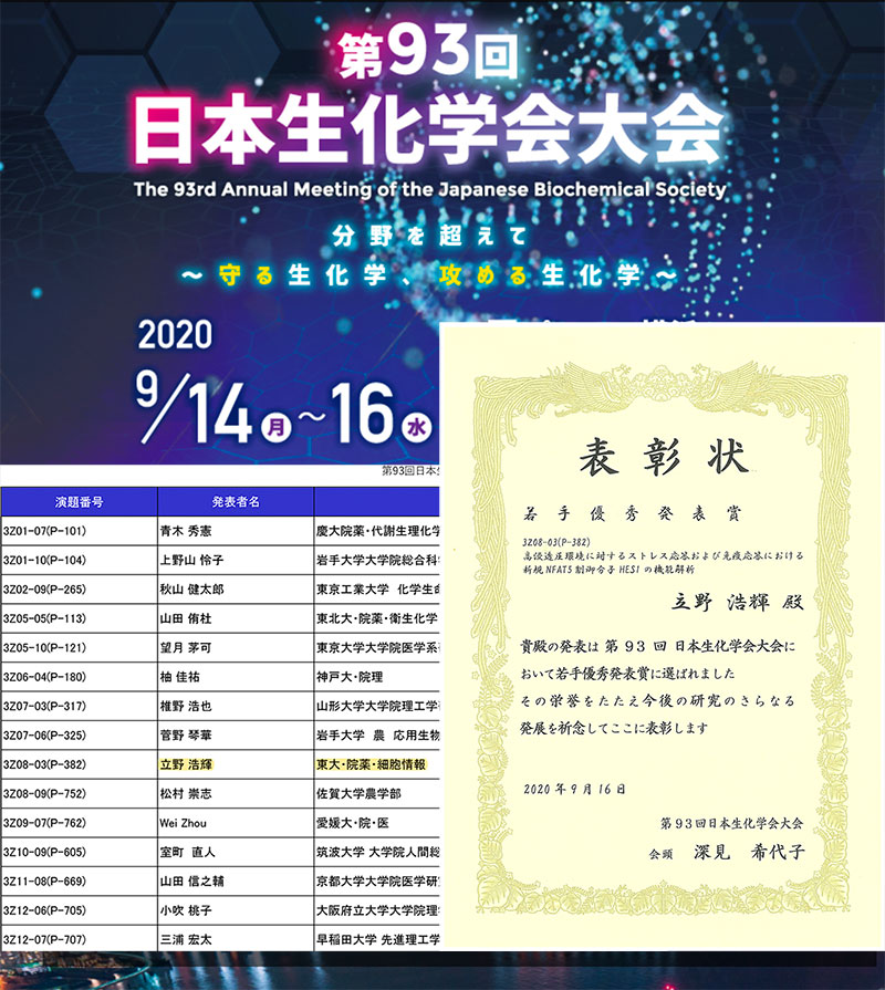 立野浩輝:第93回日本生化学会大会「若手優秀賞」受賞