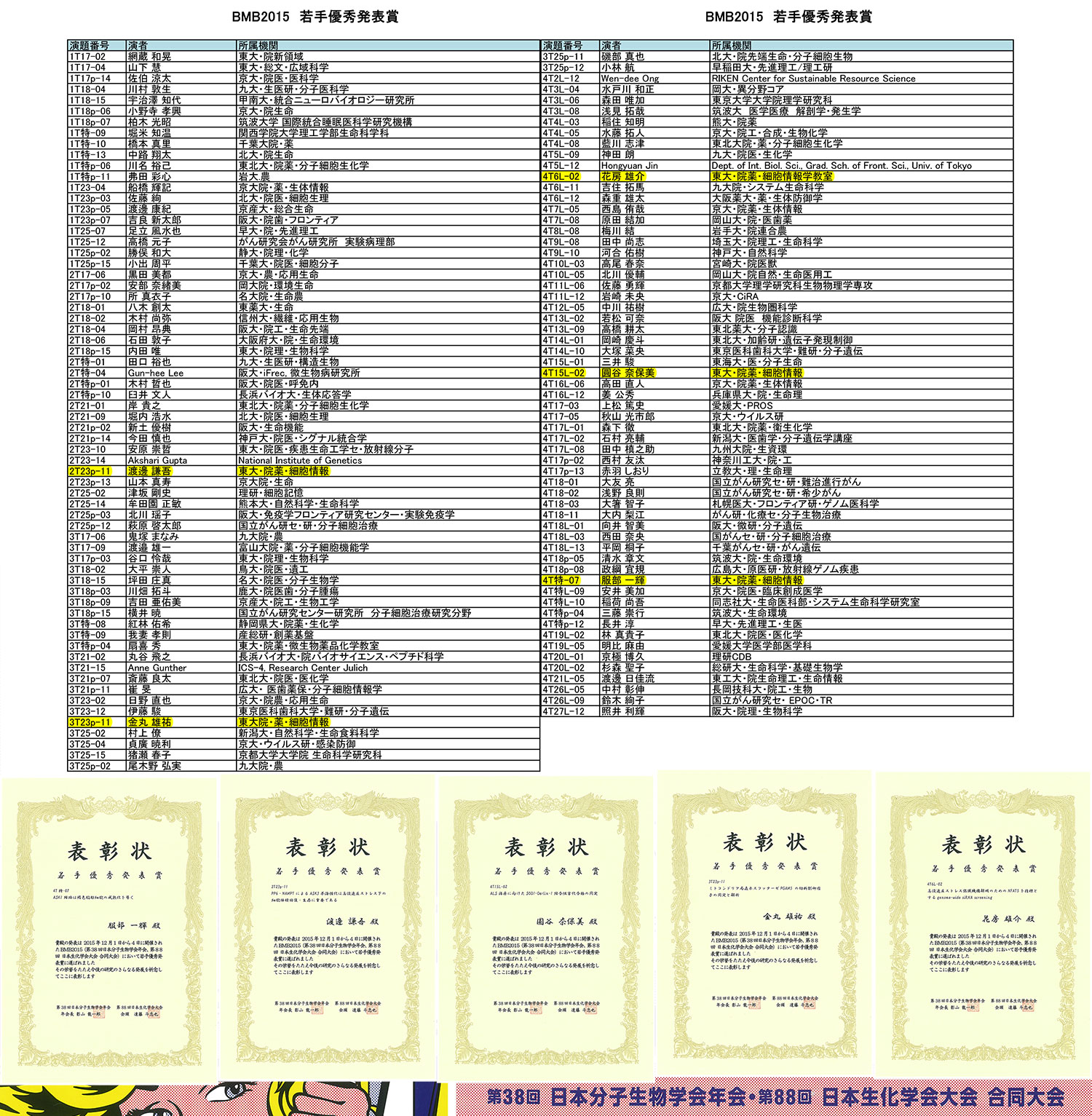 服部一輝,渡邊謙吾,金丸雄祐,圓谷奈保美,花房雄介: BMB2015 若手優秀発表賞受賞