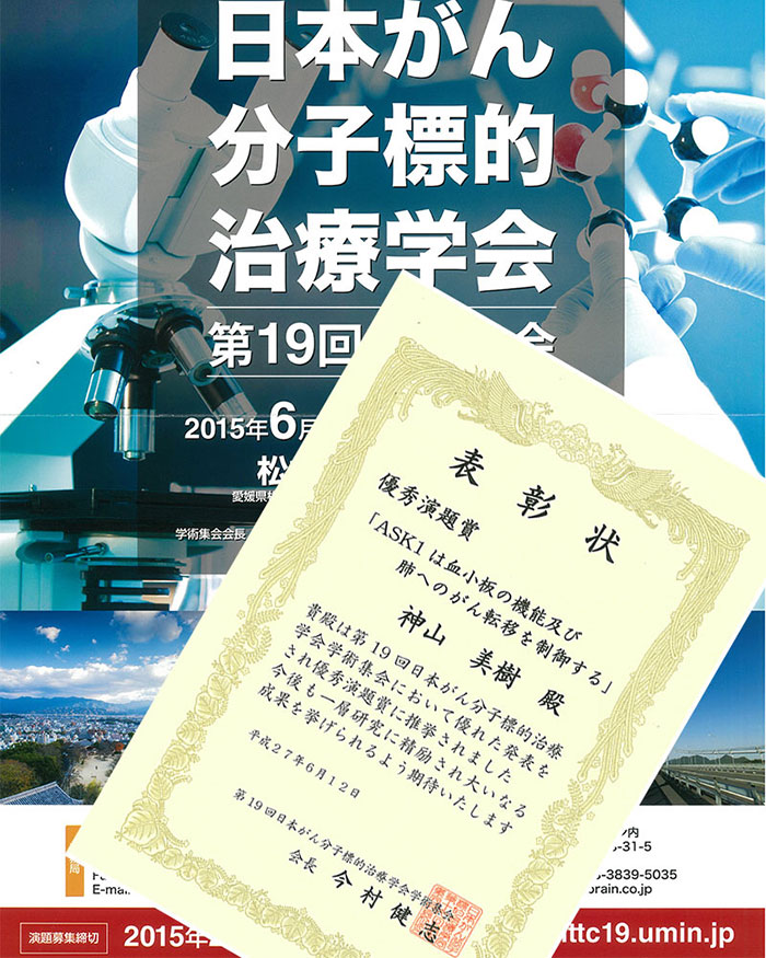 神山美樹:第19回日本がん分子標的治療学会学術集会 「優秀演題賞」受賞