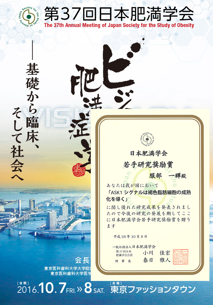服部一輝:2016年度日本肥満学会若手研究奨励賞(YIA)」受賞