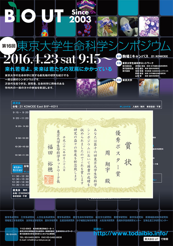 周 翔宇:東京大学生命科学シンポジウム「優秀ポスター賞」受賞