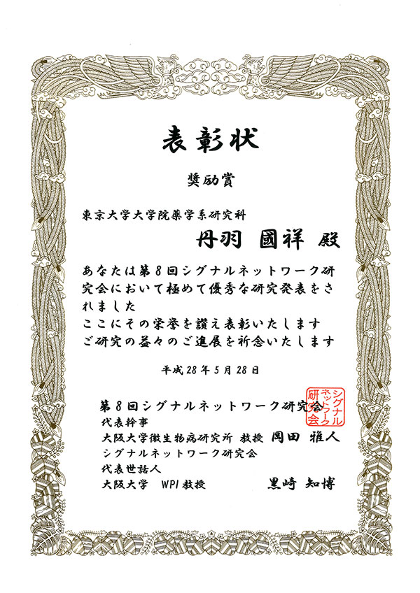 丹羽 國祥:第8回シグナルネットワーク研究会「奨励賞」受賞