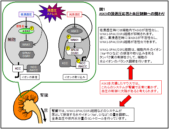 “浸透圧に応じて”と書きましたが、ASK3の浸透圧ストレスに対する応答性は他の分子にはあまり見られない独自のものです。以前にも書いたように、ASK3は細胞の周囲が低浸透圧になればなるほど活性化し、高浸透圧になればなるほど不活性化するという連続的で、かつ両方向性の活性変化を示します。応答の早さも1-2分で変化する素早いもので、可逆的であることから、ASK3は細胞が周囲の浸透圧変化を測るための浸透圧メーターのような働きをしていると考えられます。また、ASK3は『浸透圧という物理的な量』を『キナーゼ活性によるリン酸化反応の程度』という細胞内の化学的な反応に変換する変換機として働いていると見ることもできます。生体のストレス応答とは、生存に適した状態から環境がシフトした場合に、それに対応して適応しようとする動きです。その際、『シフトの方向と程度を測り、それに応じたアウトプットを出力する』ことが必須項目であり、まさにASK3は浸透圧ストレス応答において適した性質を持つ分子だと考えられます。 さて、ここで、ASK3の浸透圧に依存する独特の活性変化がどのようにして引き起こされているかという疑問が浮かびます。実は、そもそもヒトの細胞自体が浸透圧をどうやって感知しているかについて未だ不明な点が多く残されています。この問題について、私たちはASK3の活性変化を指標にしてアプローチしようと考えています。ASK3はそれ自身の活性がリン酸化により制御されているため、浸透圧依存的にASK3のリン酸化を制御する分子が存在すると考えられます(図2)。