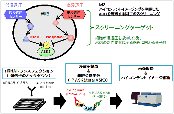 2009年度版 2009年度になり、とうとう名黒グループも5年目になりました。 グループの研究テーマとしてはASK3というリン酸化酵素についての研究を継続しています(詳細は前年度以前を参照)。ASK3は低浸透圧に対して活性化、高浸透圧に対して不活性化するという非常に面白い“両方向性の”キナーゼ活性の変化を示しますが、この独特の浸透圧ストレスに対する活性変化がどのような分子メカニズムにより達成されているかについては全く分かっていません。私たちの研究からASK3に結合するチロシンキナーゼやASK3を脱リン酸化するフォスファターゼが明らかになり、これらによるASK3の活性制御機構を現在解明しようとしているところです。 また、ASK3活性制御メカニズムを担う分子群を網羅的に同定するために今年からひとつ新しい技術を導入しました。High-Content Analysis(HCA)技術と呼ばれる大規模なスクリーニングなどを行うためのスループットに優れたシステムです。今回導入したのは薬学部の共通機器室に設置されたThermofisher社のArrayScan VTIという画像解析機器で、この機械は細胞一つ一つの情報を数千から数万個という単位で短時間に集めることができます。この技術のすごさを説明するために、例えば私たちがASK3の解析で行ってきたリン酸化抗体を利用したキナーゼ活性の測定について、これまでのウェスタンブロットと比較してみます。 |