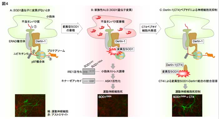 従って、変異型SOD1とDerlin-1の結合を介した小胞体ストレス誘導性ASK1活性化が運動神経細胞死を誘導し、これらのメカニズムがALSの病態進行に深く関わっていることが示されました。