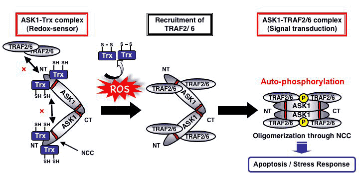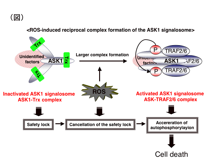 ASK1は通常、安全装置であるチオレドキシン(Trx)と複合体を形成して不活性化状態にあります。しかし、活性酸素がこの安全装置を解除し、起爆装置であるTRAFとの複合体形成が促進されると、ASK1は強く活性化されます(野口グループ2006参照)(EMBO J., 17, 2596-2606 (1998), J. Biol. Chem., 280, 37033-37040 (2005))。このモデルは、活性酸素という物理化学的なシグナルをリン酸化シグナルという細胞内シグナル伝達系に変換する機構として極めて興味深い発見であると考えています。というのも、活性酸素や紫外線などの生体に有害なストレスを細胞が感知する機構についてはその多くがいまだ解明されていないからです。