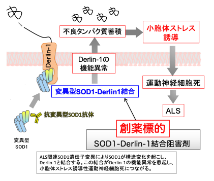 亜鉛配位タンパク質であるCu/Zn superoxide dismutase (SOD1)は、神経変性疾患である筋萎縮性側索硬化症(Amyotrophic Lateral Sclerosis; ALS)の原因として知られています。これまでに私達は、100種類を超えるALS関連変異型SOD1が毒性を発揮する共通の分子機構を明らかにしてきました。すなわち、様々な変異型SOD1が特異的に直接結合する標的タンパク質として、小胞体品質管理に重要な役割を担う小胞体膜貫通タンパク質Derlin-1を同定し、その結合が神経細胞の小胞体品質管理機構の破綻をきたし、運動神経細胞死を誘導することを発見しました[文献1]。また、その分子機構として、野生型SOD1においては立体構造上内部に隠されたDerlin-1との結合領域(Derlin-1 Binding Region; DBR)が露出することを明らかにしてきました[文献2]。どのようなSOD1遺伝子変異がSOD1タンパク質に構造変化を起こすのかについては、データベースとしてGitHub上での公開も行っています(https://github.com/TakaoFujisawa/SOD1_database)。最近、この分子機構に基づき、ALSモデルマウスの寿命延長効果のあるSOD1-Derlin-1結合阻害化合物の開発に成功しました[文献3]。現在、SOD1-Derlin-1結合阻害化合物のALS治療薬としての実用化に向けた展開を進めています。