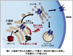 膜タンパク質は、私たちの体内のありとあらゆる細胞で細胞内外の物質のやりとりやシグナル伝達、生体物質の代謝反応など、細胞の正常な機能の維持に重要な役割を果たしています。膜タンパク質の細胞内における主要な合成の場は、小胞体(Endoplasmic reticulum: ER)という細胞内小器官です(図1)。リボソームで合成された膜タンパク質の前駆体はまず小胞体膜へと挿入され、小胞体の内外に存在するシャペロンという分子群の助けを借りながら正常な形へと折り畳まれます。正常な立体構造を獲得できた膜タンパク質は小胞体から搬出され、様々な細胞内小器官で正常タンパク質として機能します。しかし、膜タンパク質は折り畳みが難しいものが多く、一定の割合で折りたたみに失敗した不良膜タンパク質が生じます。また、膜タンパク質自体やシャペロン群をコードする遺伝子への変異、あるいは様々なストレスにより不良膜タンパク質が大量に生じやすくなります。このような不良膜タンパク質は小胞体に蓄積して小胞体ストレスと呼ばれるストレス状態を引き起こし、最終的には細胞死に繋がります。小胞体への不良膜タンパク質の蓄積は筋萎縮性側索硬化症やパーキンソン病、網膜色素変性症をはじめ多種多様な疾患においてみられ、これらの疾患発症の引き金となりうることが提唱されています。