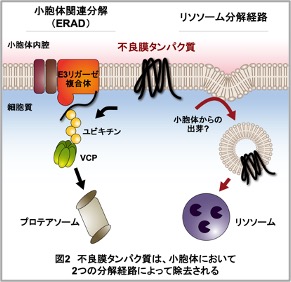 このような不良膜タンパク質の蓄積を防ぐため、小胞体には不良膜タンパク質を選択的に分解して除去するシステムが存在します(図2)。その一つが小胞体関連分解(ER-associated degradation: ERAD)と呼ばれる分解経路です。ERADにおいて不良膜タンパク質は、小胞体膜上のE3リガーゼ複合体にユビキチン化修飾を施され、VCPによって小胞体膜から引き抜かれてプロテアソームという巨大分子複合体に運ばれ、分解されます。一方で、特に凝集しやすい不良膜タンパク質はリソソームという細胞内小器官に輸送されて分解されると考えられていますが、その詳細なメカニズムは明らかになっていません。本グループでは、ほぼ未解明のリソソーム分解経路の分子メカニズムの解明を目指しつつも、ERADについてもさらに詳細な分子メカニズムを明らかにしていくことで、小胞体における不良膜タンパク質分解の全体像を解明していきたいと考えています。